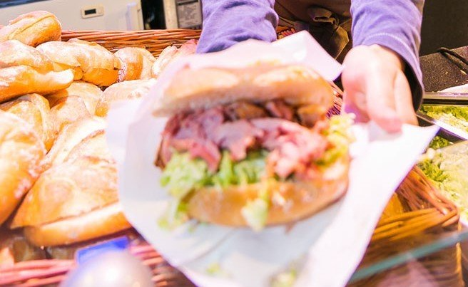 In eigenen Räumlichkeiten: belegte Brötchen, heißer Kaffee oder Tee bayrischer Leberkäse,